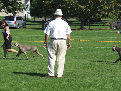 Sunday was the annual Garden State Weimaraner Club Independent Specialty Show at North Branch Park. A month and a half ago, thanks to Hurricane Irene, this park was under water. Well, time to dry out and we had a gorgeous lawn to show our dogs on and it was a sparkling, hot fall day. The club put on our usual outstanding show and everyone had a great time showing dogs, eating the delicious hot and cold buffet supplied by club members and winning raffle prizes. This was not our regular show, as the club hosted the Weimaraner Club of America Eastern Futurity and Maturity the day before and this drew dogs and handlers from all over the country as well as Canada and Weim friends from Australia. As trophy chair, I was in charge of buying and organizing all the trophies and sponsors for them and was pleased with how they looked set up outside the ring and the winners seemed to enjoy them.